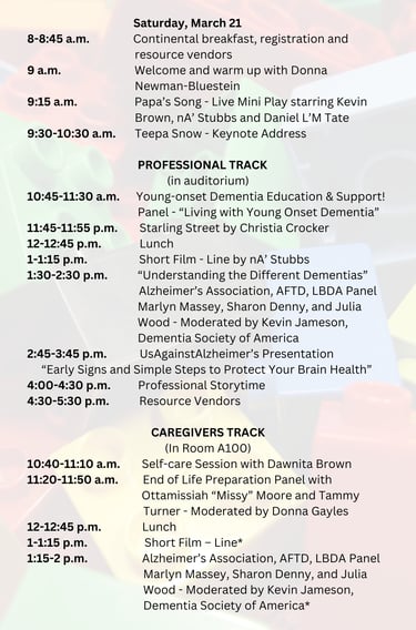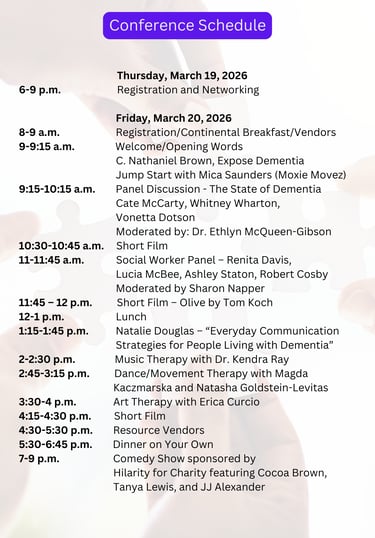 The Expose Dementia Conference 2026 - "Spring into Brain Health with the Arts" is a 2.5 -day conference at the Maritime Conference Center filled with arts and media-focused activities, resources and speakers to educate on the impact of dementia and how we can improve the quality of life for those living with dementia and those caring for individuals with dementia. Focused on lifestyle changes that lead to better brain health, conference sessions include:
