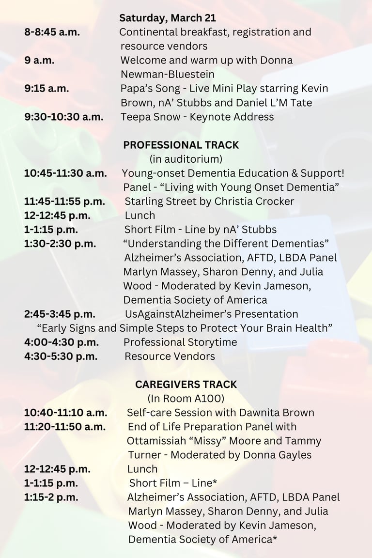 Our presenters include doctors, nurses, scientists, art therapists, music therapists, lego specialists, caregivers, and professors all with a passion to educate about the impact of dementia and empower people to unite, get active and improve the quality of life for themselves and the ones they love.